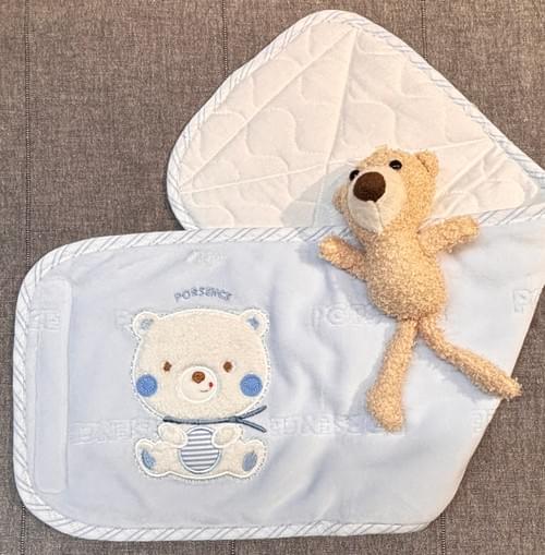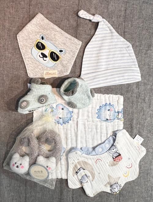 內容物含:尿布*12片 / 肚圍/ 保暖帽/ 三角領巾/ 口水巾/ 紗布巾/ 立體造型襪/ 小熊絨毛鞋/ 安撫小熊