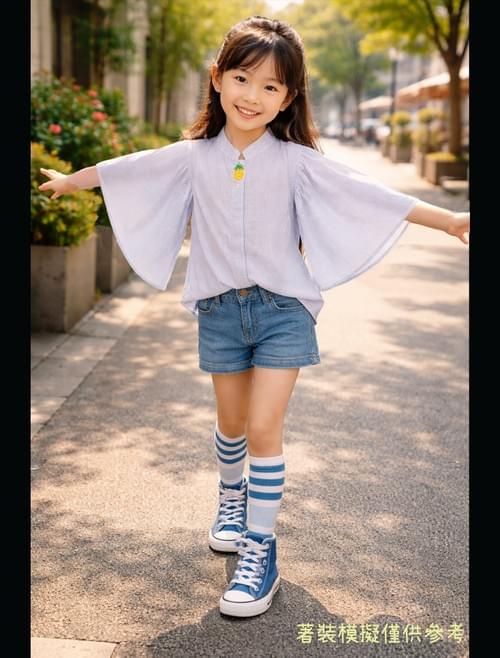 這款是大點兒女孩的襯衫, 細藍白條織紋+ 大寬袖, 款式活潑大方🤩