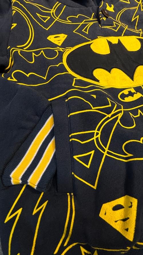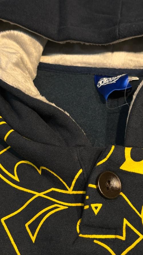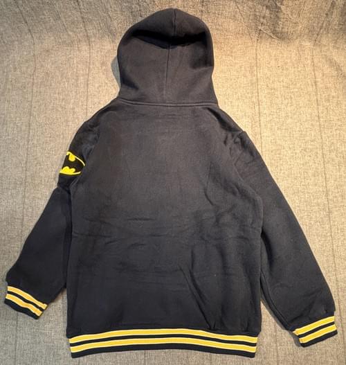 這件超厚磅的刷毛連帽T, CP值100分!🤩 百搭的丈青色印上萬人迷的蝙蝠俠, 線條圖騰的表現又酷又有型, 是件兒子爸爸都適合的T