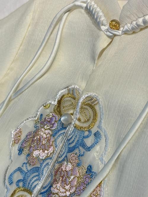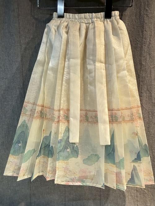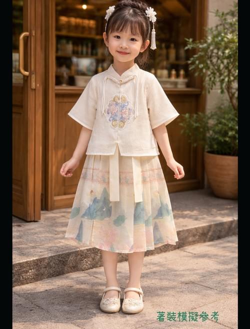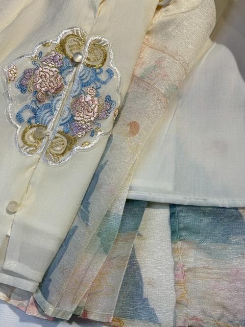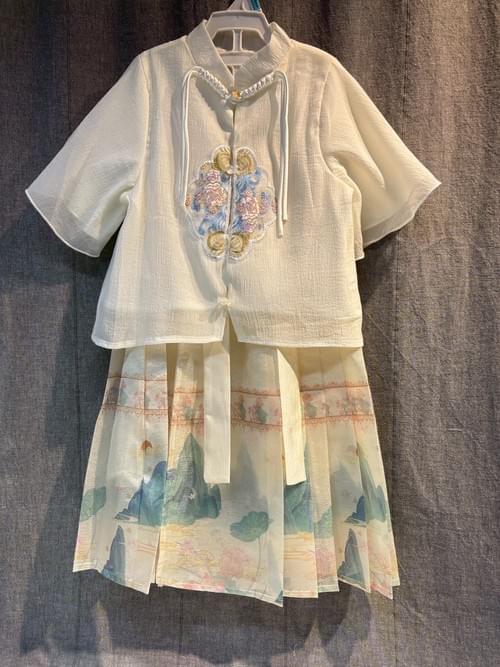 米色旗袍領開襟刺繡半袖山水馬面裙套 /VIP價1080=點數70