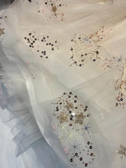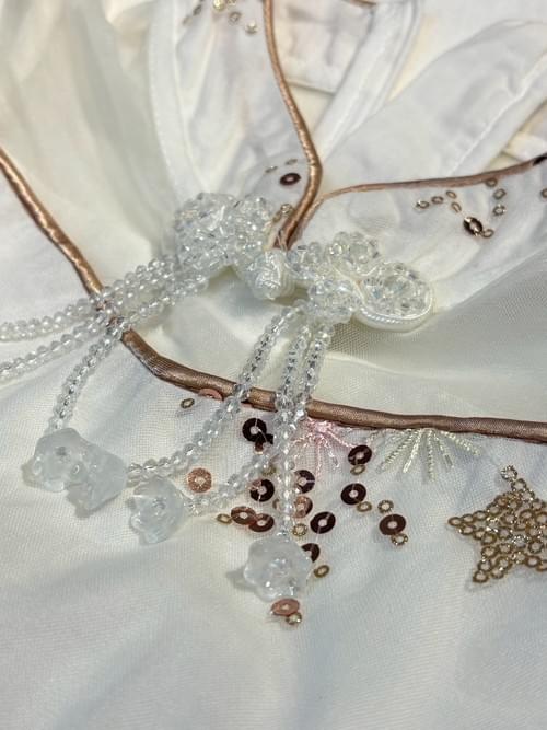 作工精美, 旗袍領滾金邊, 寶石垂珠盤釦, 網紗繡亮片布匹,