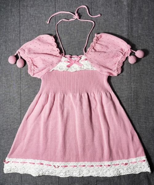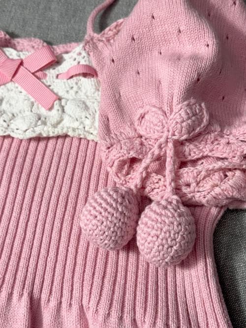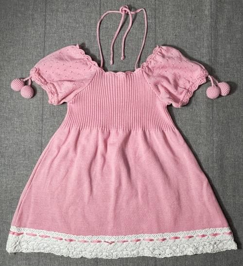 這是韓國製的棉混紡的針織洋裝, 飾有針織的棉蕾絲和縀帶, 頸部有綁帶, 袖子上還有女孩兒愛的櫻桃球球🤩