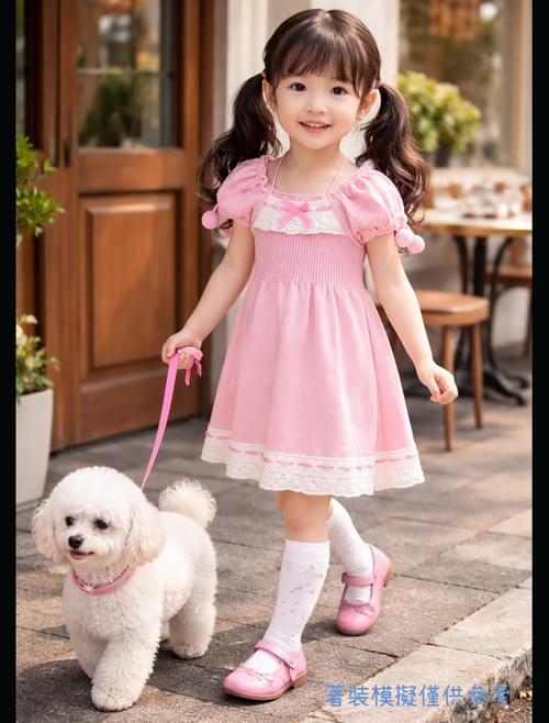 粉白織蕾絲邊袖球球針織洋裝/VIP價1100=點數150