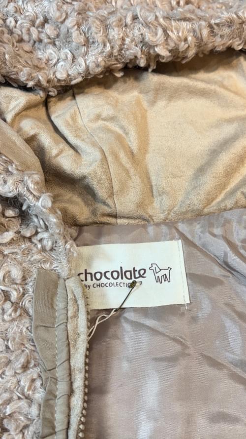 整件是奶茶色的捲捲毛, 縀面內裡, 麂皮包邊拉鍊和蝴蝶結, 還有荷葉邊下襬, 一切都是甜甜的喔~😍❤️