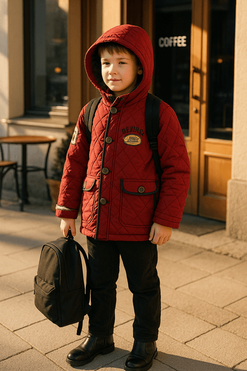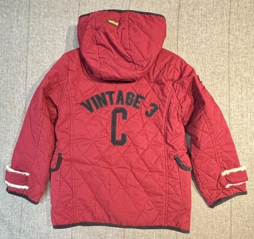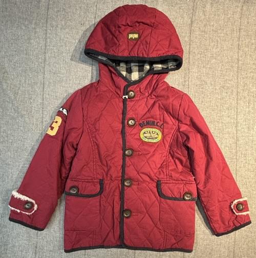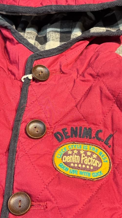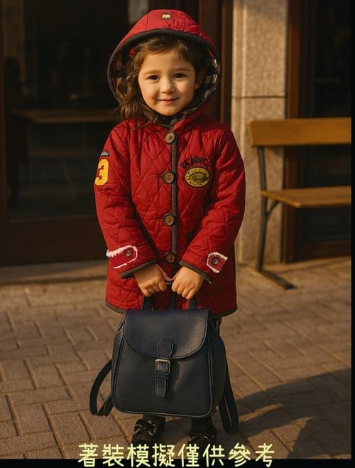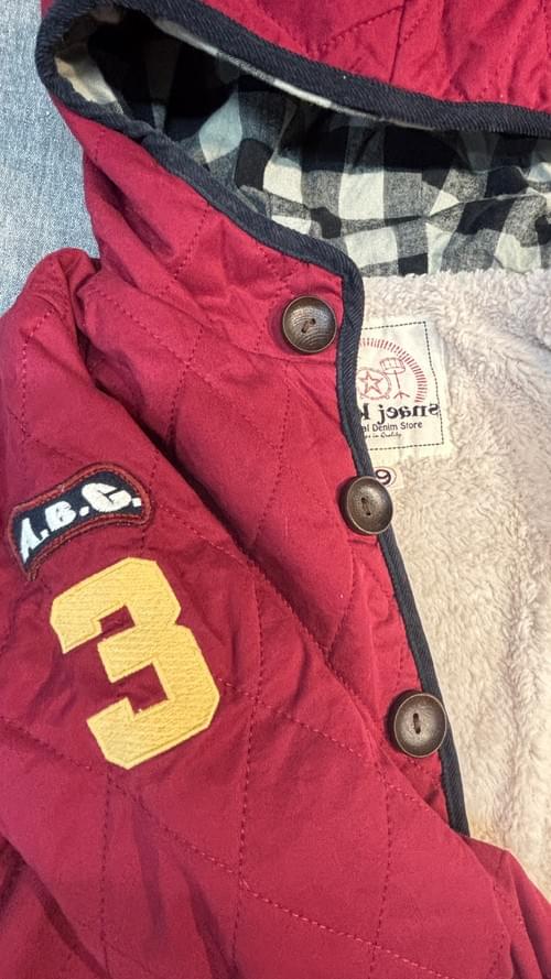 棗紅主布是緊實的100%車棉布, 衣身裡是手感實暖的棉毛層, 帽子裡是黑白格的棉布, 衣長蓋過臀部,很保暖~木釦溫暖質樸,很氣質~