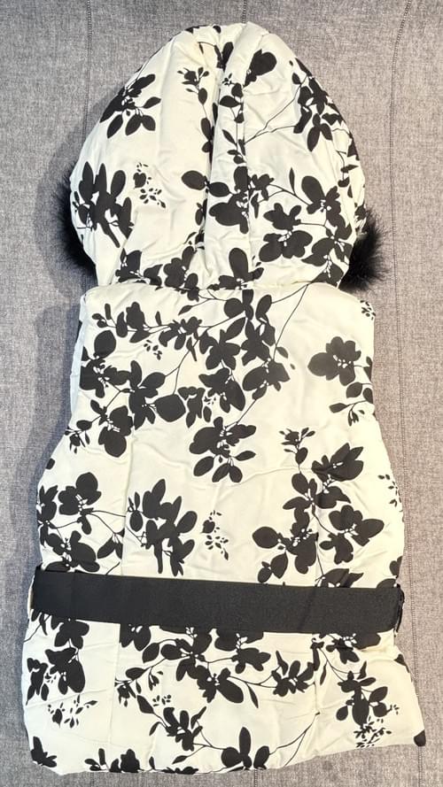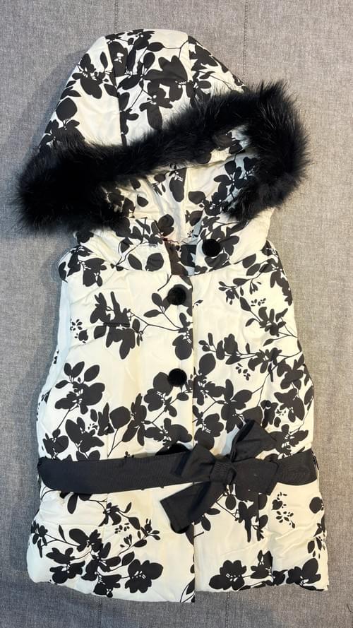 100%的韓式風格, 舖棉的連帽馬甲, 圍著一圈小貴氣的毛毛圈, 黑色圖案的印花
