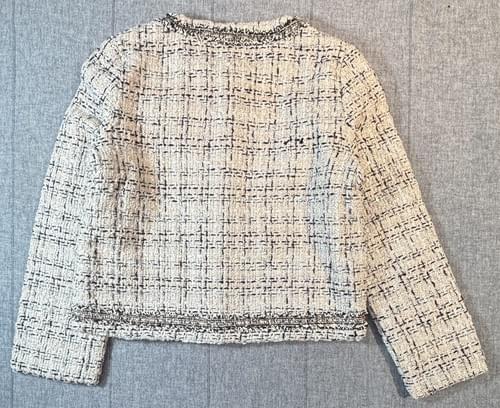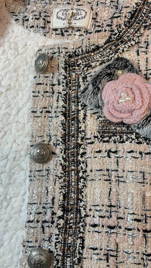 經典不敗的小香款, 杏色黑色配的粗織毛呢布, 胸前的毛絨布蝴蝶結和勾織花,綴以珍珠, 少見精美的鎳灰色銅釦, 黑金蔥鬚織邊帶, 是100%的小香風啊~🧥😍