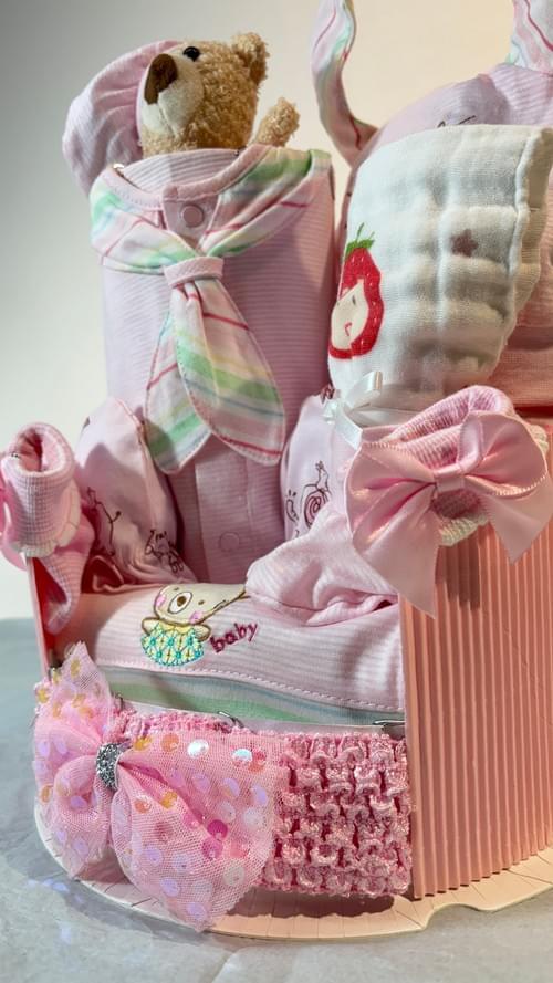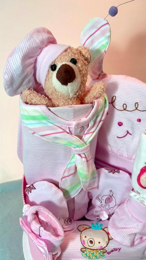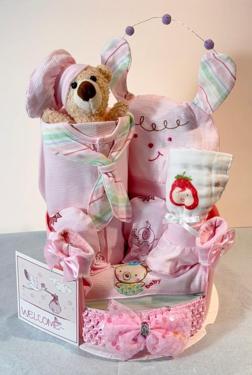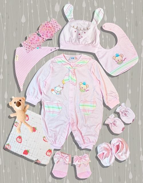 尿布*6片 / 連身衣/ 兔仔帽/ 粉條紋小熊圍巾/ 三角領巾/ 亮片髮帶/ 紗布巾/ 保護襪/ 蝴蝶結襪/ 保護手套/ 安撫小熊