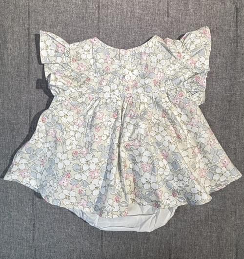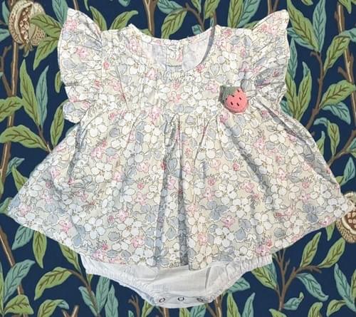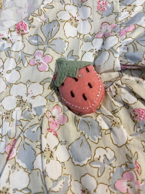外表是可愛小洋裝的包屁衣, 法式郷村調的小梨花印花布, 立體的手做草莓胸飾, 柔細的棉布手感