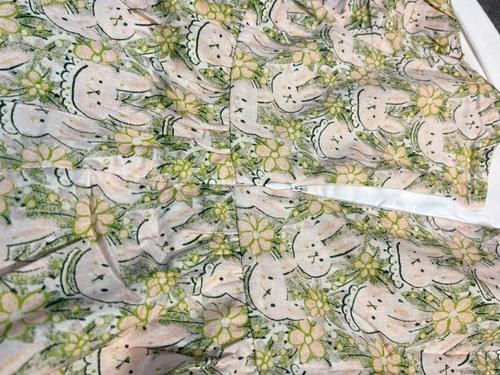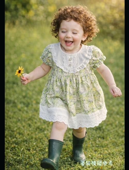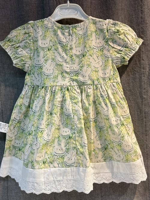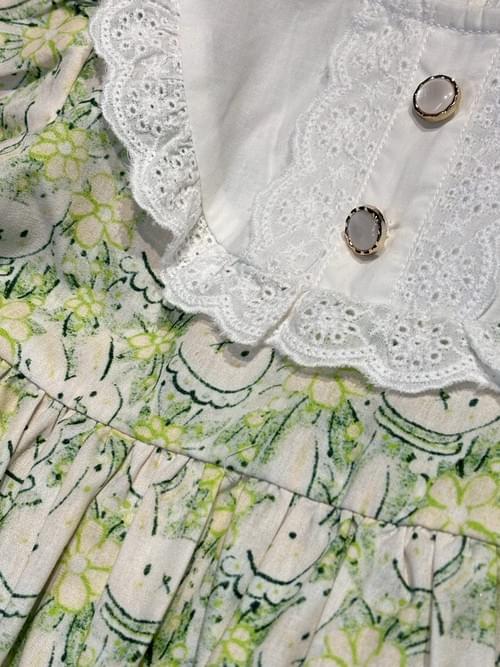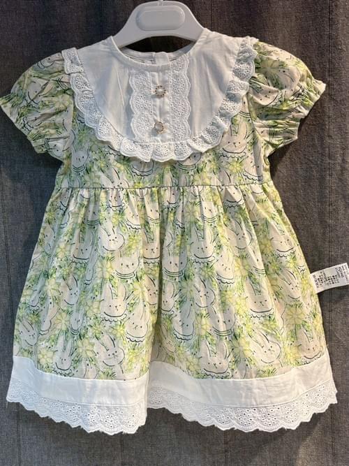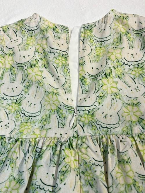 手感很細緻的棉印花布, 印滿春天氣息的綠色兔子, 穿起來蓬蓬的裙襬, 讓小寶寶們像穿梭在花欉間翩翩起舞的蝴蝶~