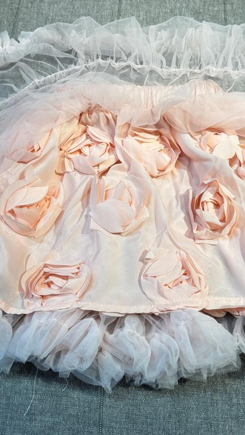 網紗裙是每個小女孩的公主童年, 這款很特別的是內層是細薄有光澤的縀布, 飾以滿滿的立體布玫瑰花, 外罩輕盈的網布, 讓人愛不釋手的BABY粉, 整個超美超夢幻~