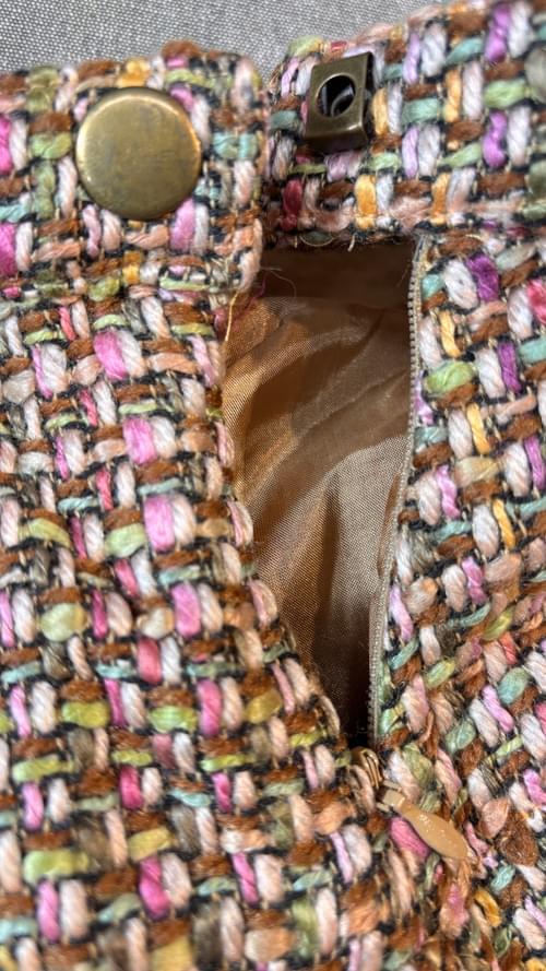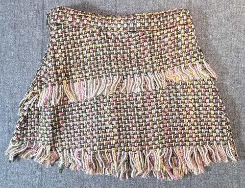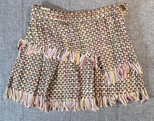 這件小香風的編織感短裙, 斜裁的版型, 鬚邊的設計, 讓冬天多了份明亮悄麗的色彩~