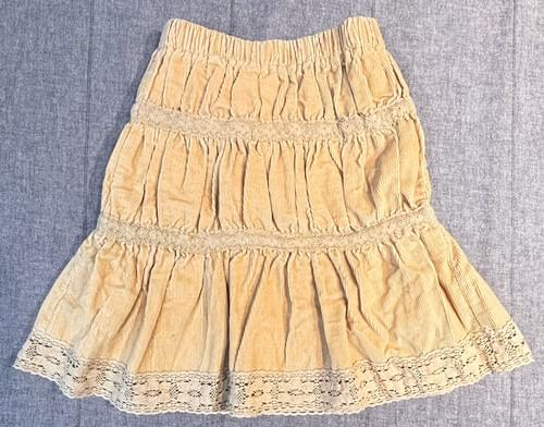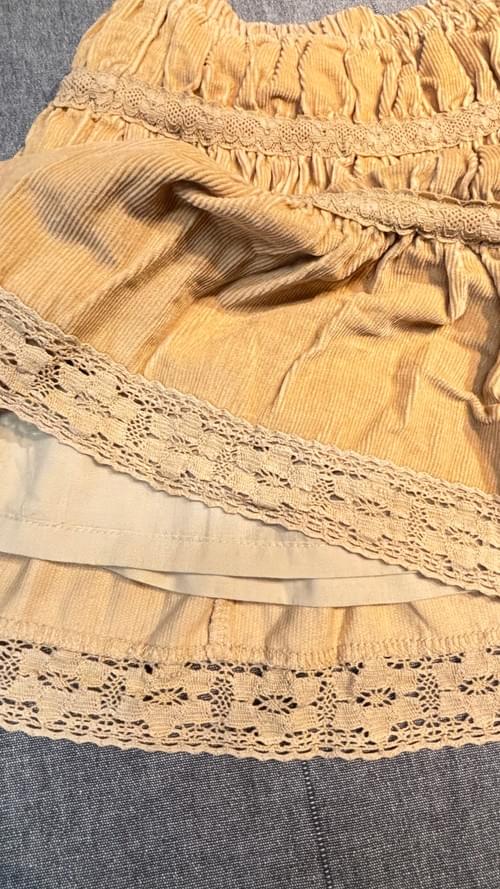 直條絨是超經典美式鄉村風, 及膝的裙長, 二道彈性蕾絲壓出柔美的輪廓線條