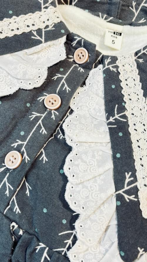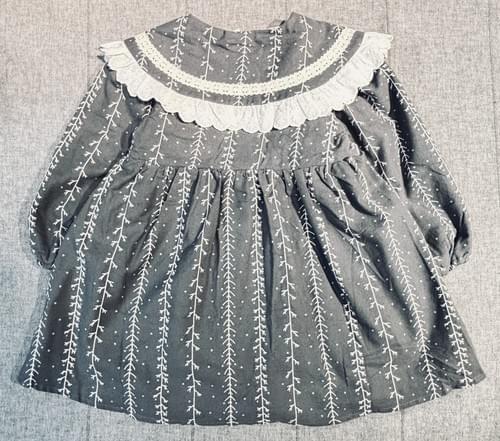 灰色小直白花布大尖領滾白織帶洋裝/VIP價480=點數40