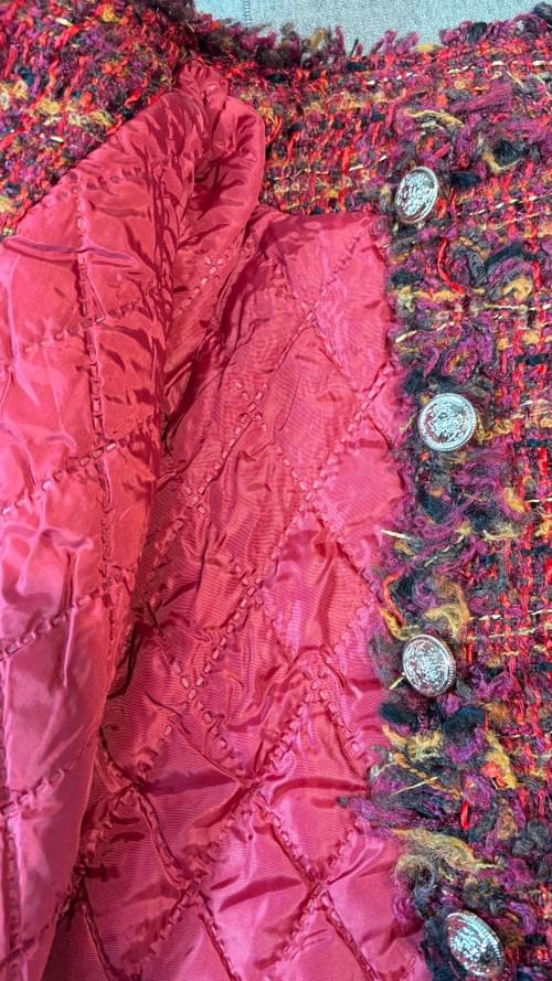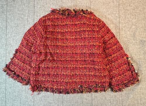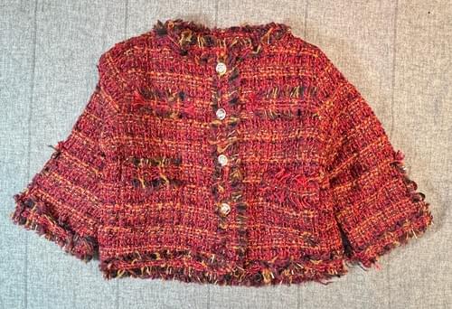 喜氣洋洋的小香風來啦~主布是100%的小香風粗織的毛呢布,領口門襟袖口袋口也都是100%小香鬚邊效果😁,銀色釦,二個裝飾袋,二個插式口袋,短版外套很好活動,非常適合活潑的小美女😁😉