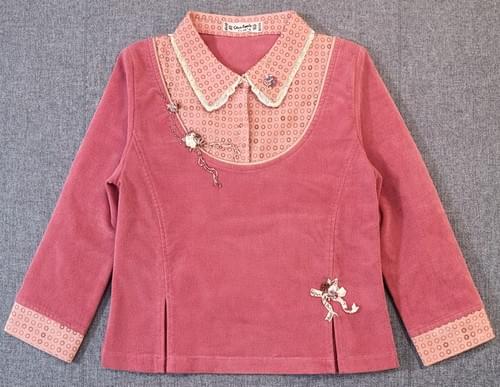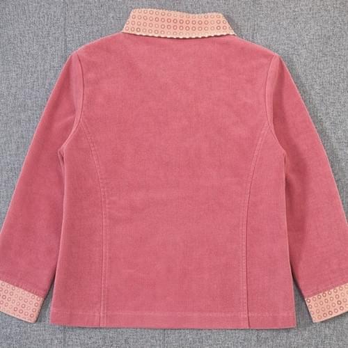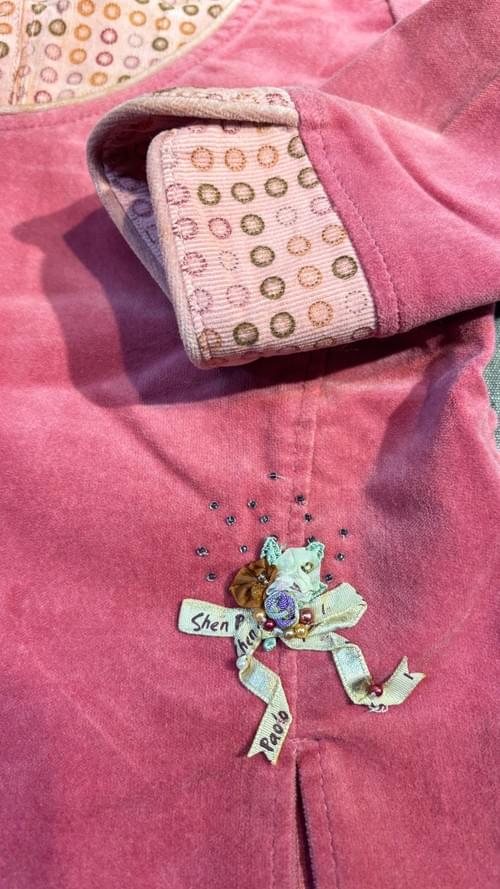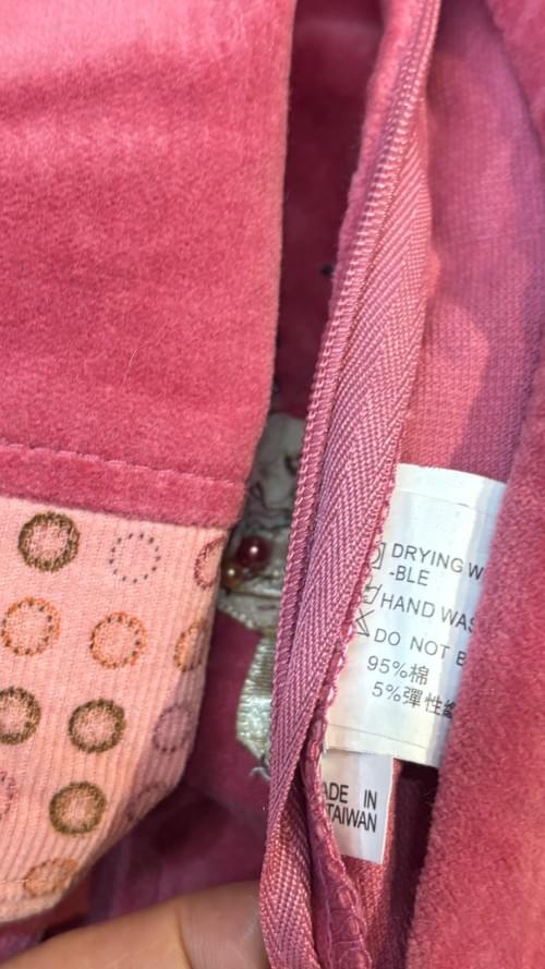 這件台灣製的絨布假二件上衣, 內是印著圈圈的細直條絨布, 外是妝紅色的細絨布, 點綴著可愛的立體小花😍, 是很有特色的單品, 還兼有不錯的保暖效果喔 ~