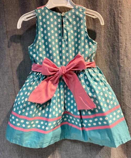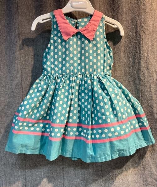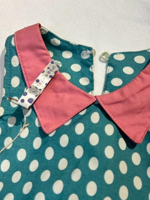 湖水綠白點桃紅尖領削肩洋裝/ VIP價650=積點140
