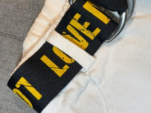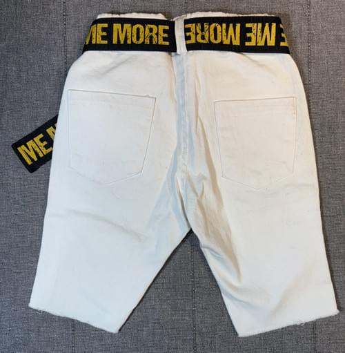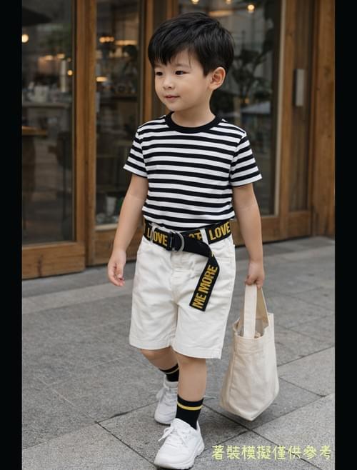 白色的五分長斜紋布褲, 附有黑色印黃色字母的腰帶, 上身帥氣! 🤩