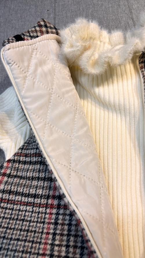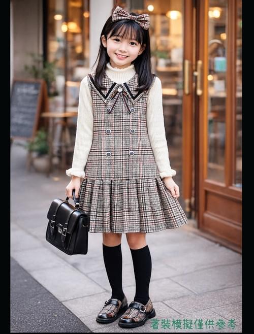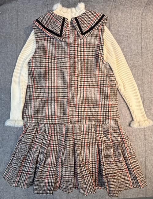 大女孩-米毛領針織衫+犬齒格無袖低腰二件套洋裝/VIP價790=點數60