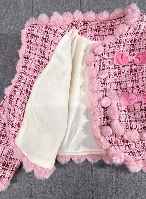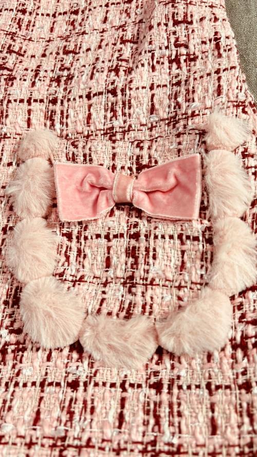 標誌性的小香風格=粉粉毛料十字織布+可愛的蝴蝶結+毛球邊,只要內搭簡單的高領衫和褲襪就可以美美的出行啦,各種場合都hold得住!😉