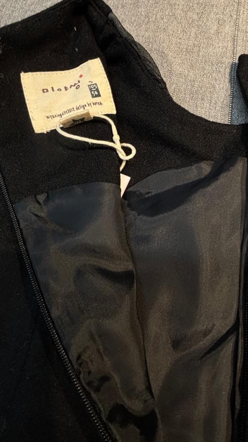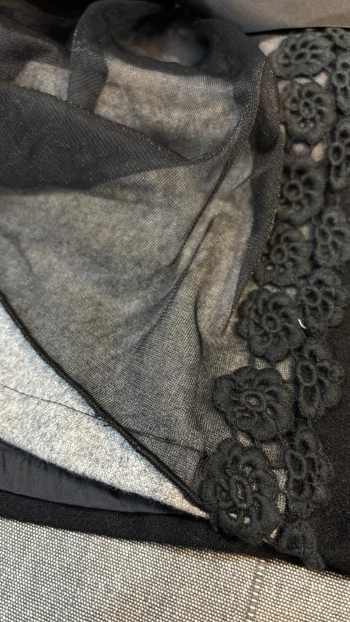 黑色灰色剪接的毛料布, 覆有透黑紗, 飾以立體棉織蕾絲花, 縀面蝴蝶結, 簡潔大方!
